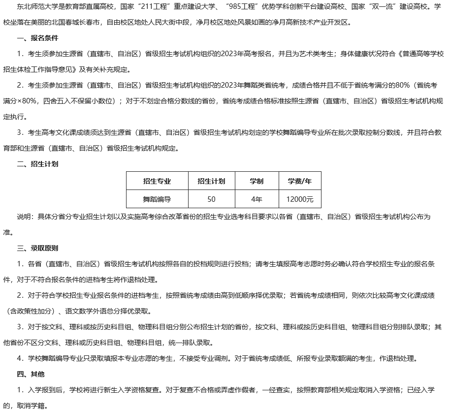 东北师范大学2023年舞蹈编导专业招生简章